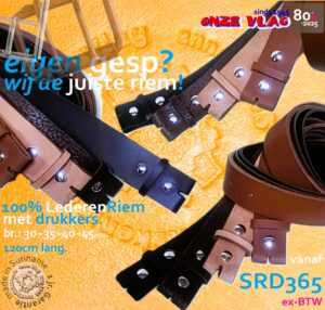 BESCHIKBAARHEID van items is afhankelijk van het moment en de verkopen.SRD-PRIJZEN (exclusief-BTW): onder voorbehoud!Voor actuele informatie kom graag bij ons langs of stuur een appje met uw vraag + de foto van het item. Lederen riemen standaard 110-120cm lang; Maat XL-XXXXL ook beschikbaar. Breedte van de riem: afh. van de gesp (25mm t/m 100mm). Een riem met jouw eigen gesp? Ja, dat kan! Uniform-riemen voor de afdeling of bedrijf? Ja, dat kan ook; vraag vandaag nog een offerte aan. Allemaal door ONZ vervaardigd met 1 jr Garantie op de gesp & leder. Kwaliteit als geen ander! Zie onderaan deze pagina onze specificatie lengte maten.