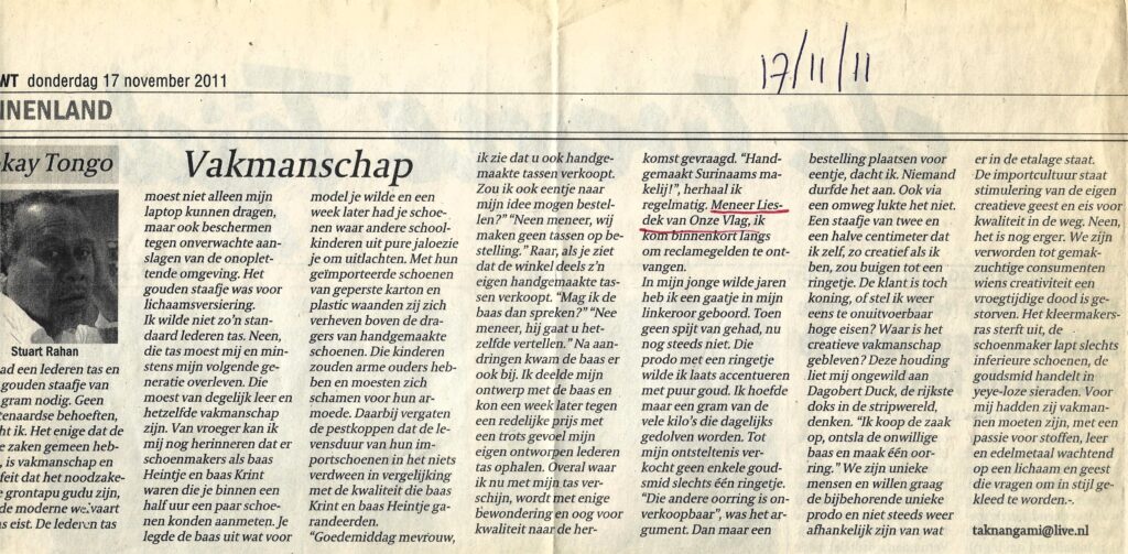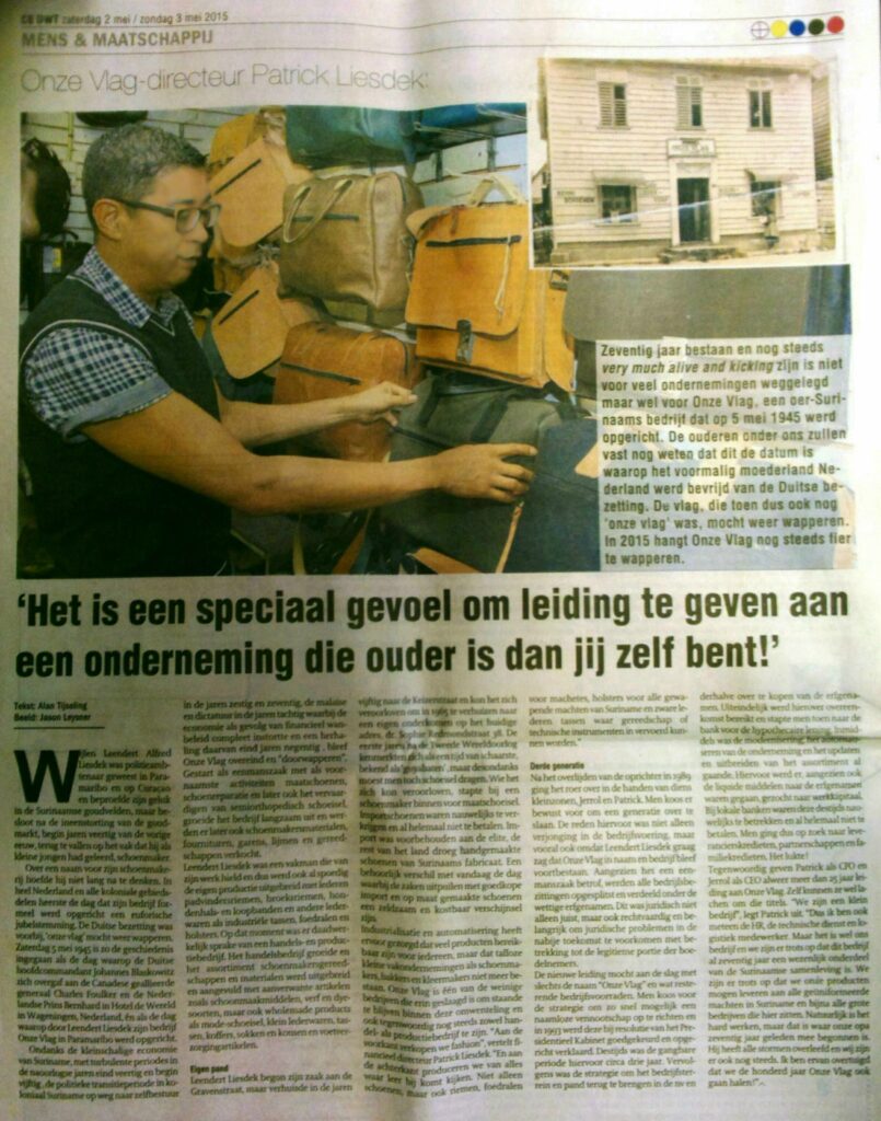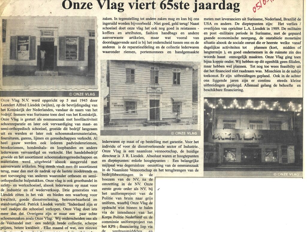 Onze Vlag is opgericht op 5 mei 1945 door Leendert Alfred Liesdek (wijlen), Bevrijdingsdag van het Koninkrijk der Nederlanden, hetgeen de herkomst van de naam van het bedrijf doet raden. Immers Suriname was toen deel van het Koninkrijk. De huishoudkleuren toen waren daarom Rood-Wit-Blauw; deze kleuren zijn “opgeëist” en vanwege historisch redenen aangehouden. Vooraf aan de oprichting van Onze Vlag, was Leendert eerst samen met zijn broer Herman actief in hun eigen gezamenlijke schoenmakerij (Gebr. Liesdek). Eerst aan de Zwartenhovenbrugstraat, vervolgens op de hoek van de Prinsenstraat en de Hofstraat. Daarna noodgedwongen wederom verhuisd, nu naar de hoek aan overkant op hetzelfde adres. Dit was aan het eind van de jaren 30, begin jaren 40. Hier heeft waarschijnlijk de later ook bekende schoenmaker Kamperveen als leerling bij Liesdek het schoenmakersvak dan ook geleerd.